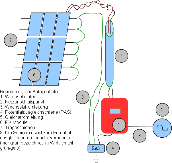 Die Sonne scheint auf die Module (6). Die wandeln einen Teil des Lichts in elektrische Energie, die als Gleichstrom in den Wechselrichter (1) fließt. Dieser wandelt den Gleich- in einen netzsynchronen Wechselstrom. Über einen zusätzlichen Zähler wird der Wechselstrom ins öffentliche Niederspannungsnetz (2) eingespeist oder selbst verbraucht. Alle Anlagenteile sind geerdet (4, 7 und 8), damit z.B. bei Isolationsfehlern keine gefährliche Berührungsspannung auftreten kann.